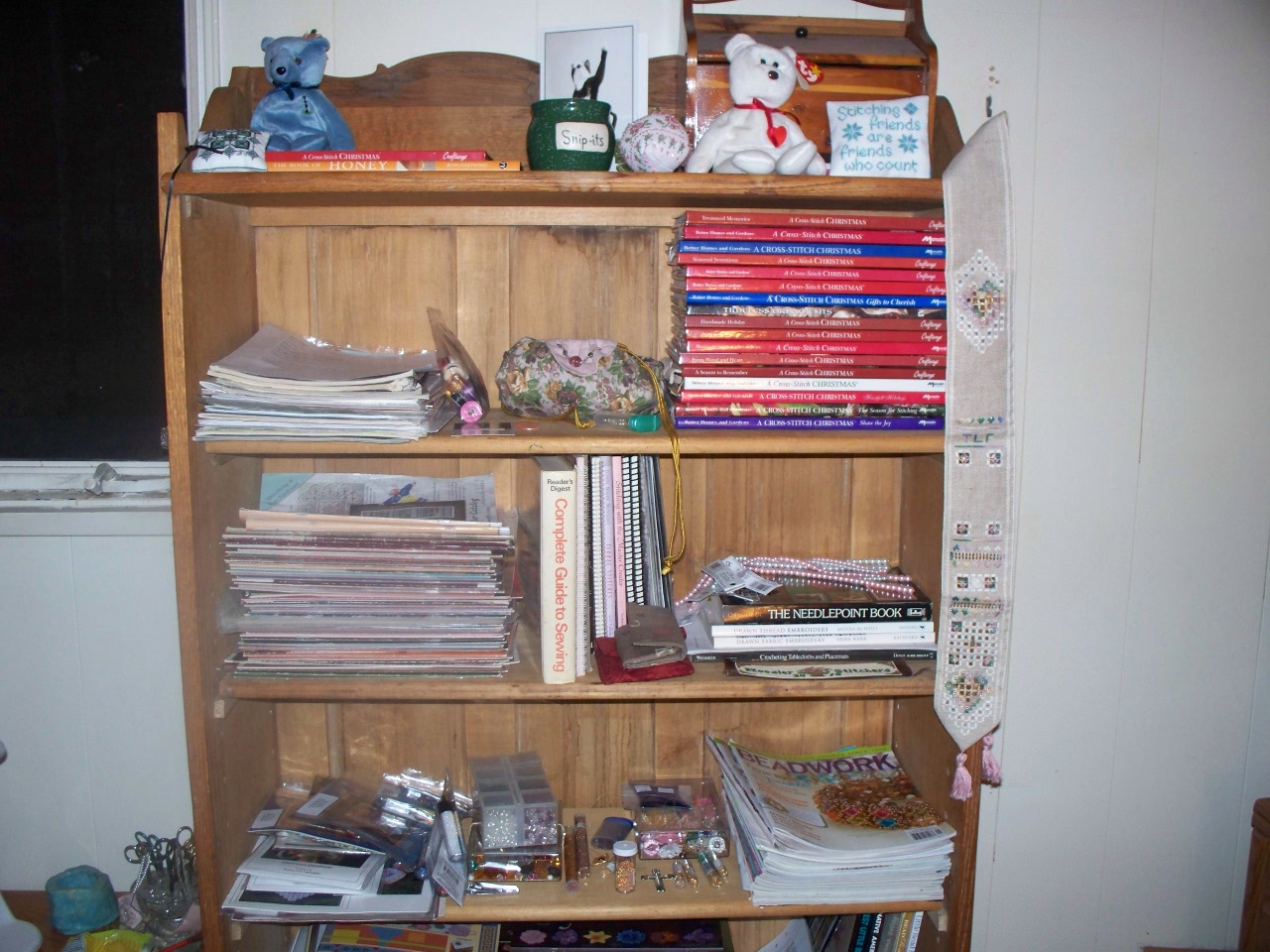 Your beaded necklace looks beautiful! Wow! You certainly got a lot of stash! How great that your mom went with you too. The bookshelf looks perfect all loaded up with stitchy stuff. That is so nice of you to stitch something for your ex and his wife for their son.